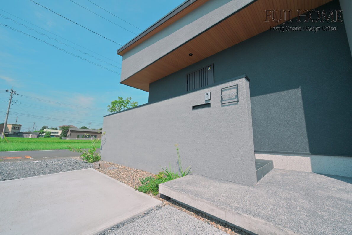 軒の張り出しを支えるように門袖を重ねました。ハウスメーカー様独自の外壁仕上げのため、まったく同じにとはいきませんが壁の仕上げが建物外壁とできる限り揃うように現場で苦心いたしました。さらに大判に造作した浮き床仕様のステップを右側に重ね左側に寄った重心のバランスをとりました。