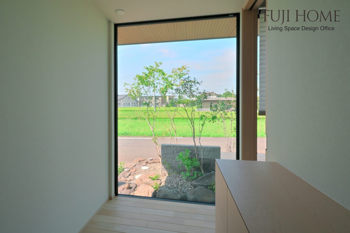 室内からの坪庭。玄関框をあがるとその先のFIX窓に坪庭の景が広がります。それほど目立つまわりの建物などがなかったので、田んぼの緑や広がる空を借景として。