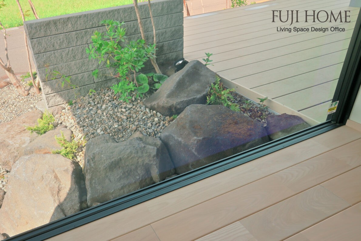 内部空間と繋がりが持てるよう、デッキ色も室内のフローリングと近い色味のものに。室内でありながら、自然石の表情をこれだけ近くで楽しめるのも面白いかと思います。