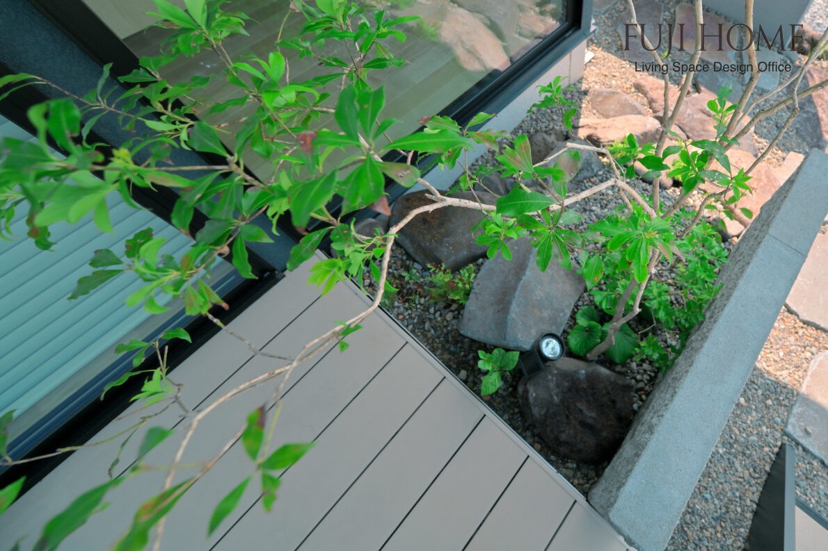 デッキからも、室内からも自然を近くに感じられる坪庭空間。