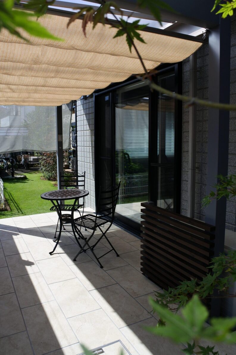 お手入れもしやすいタイルテラスは木目調にしナチュラルに仕上がりました。