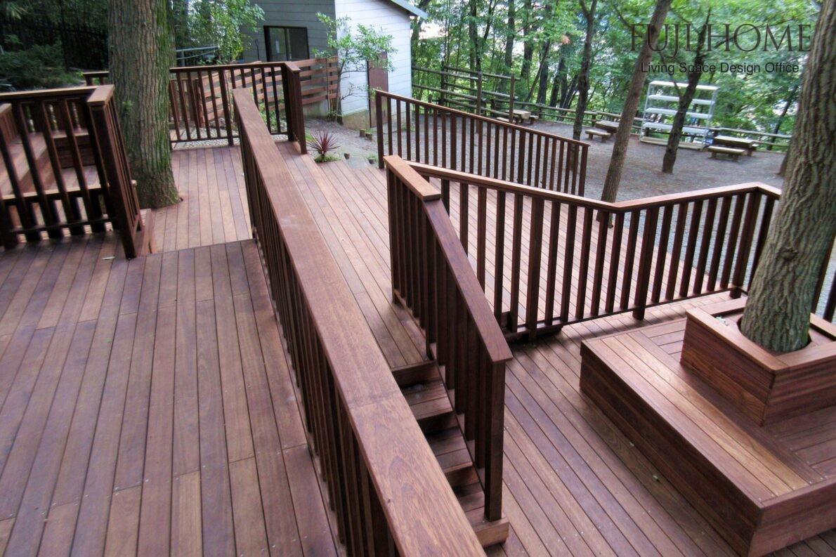 天然木のウッドデッキ。人工木に比べ施工の自由度が高く、今回のような特殊な形状やフェンス造作にも向いています。