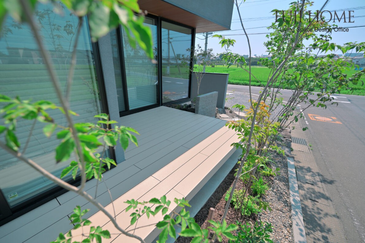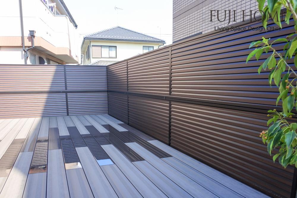 広さのあるウッドデッキで外でも寛げ、お部屋からお庭に出やすなるよう。また、正面にはいままでの生垣を整理し木樹脂のフェンス材を設置いたしました。