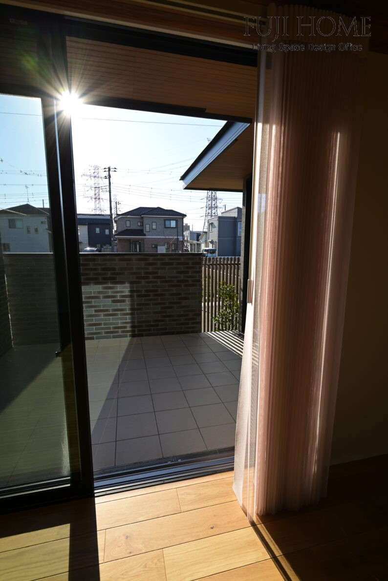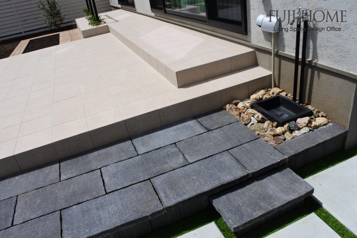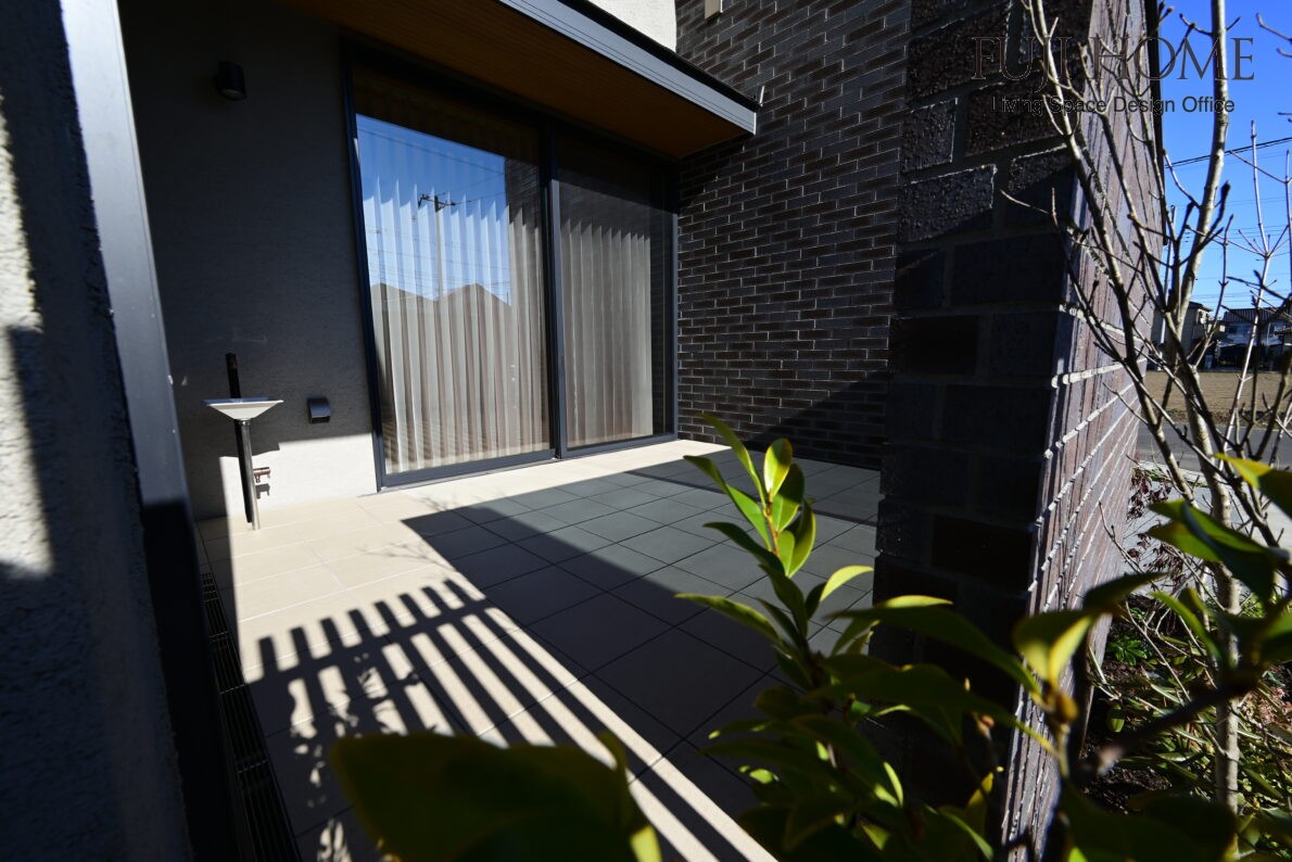 室内からシームレスにテラスに出られるよう、建築側で窓サッシをフラットレール仕様にて選択してもらっています。その面に合わせて外構にてタイルテラスを造作。建物計画と外構計画、すり合わせができていないと思っていたようにはできない場合も。