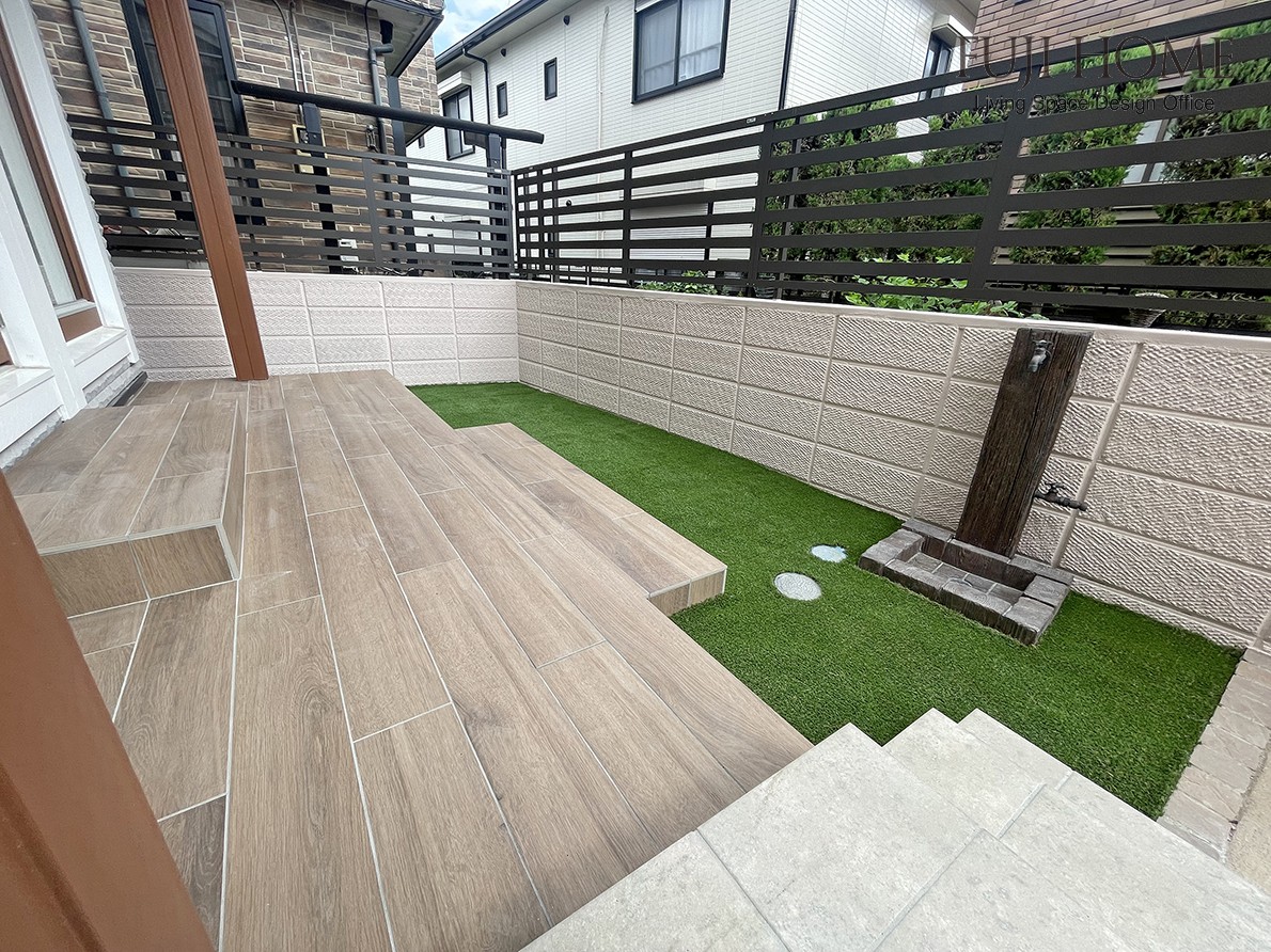 広さのあるウッドデッキで外でも寛げ、お部屋からお庭に出やすなるよう。また、正面にはいままでの生垣を整理し木樹脂のフェンス材を設置いたしました。